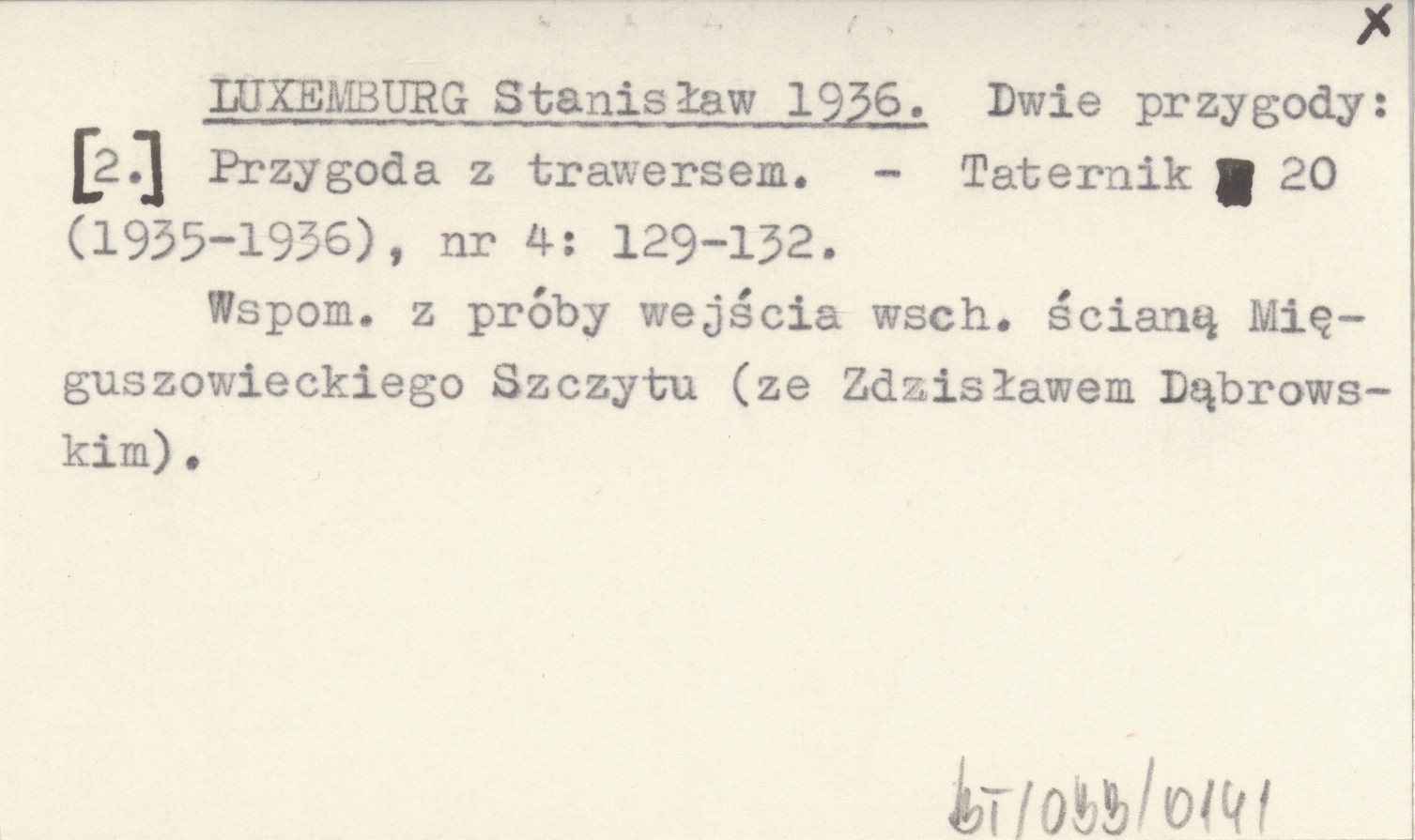 Taternik, 20 (1935-1936), nr 4: 129-132. Wspom. z próby wejścia wsch. ścianą Mięguszowieckiego Szczytu (ze Zdzisławem Dąbrowskim).
