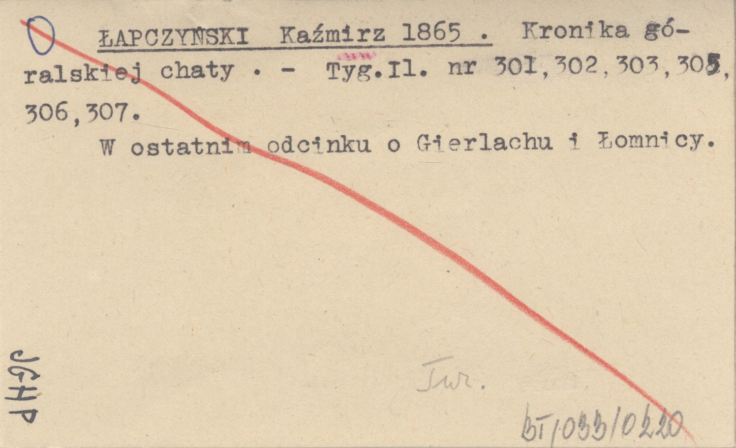 Tygodnik Ilustrowany, 12, nr 301: 6-7 ; nr 302: 17-19 ; nr 303: 25-27 ; nr 305: 50-51 ; nr 306: 58-59 ; nr 307: 69-71. W ostatnim odcinku o Gierlachu i Łomnicy.