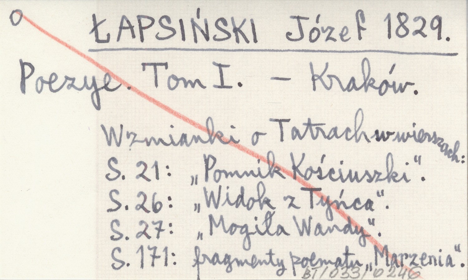 Kraków , T. 1. Wzmianki o Tatrach w wierszach: s. 21: "Pomnik Kościuszki" ; s. 26: "Widok z Tyńca" ; s. 27: "Mogiła Wandy" ; s. 171: fragmenty poematu "Marzenia".