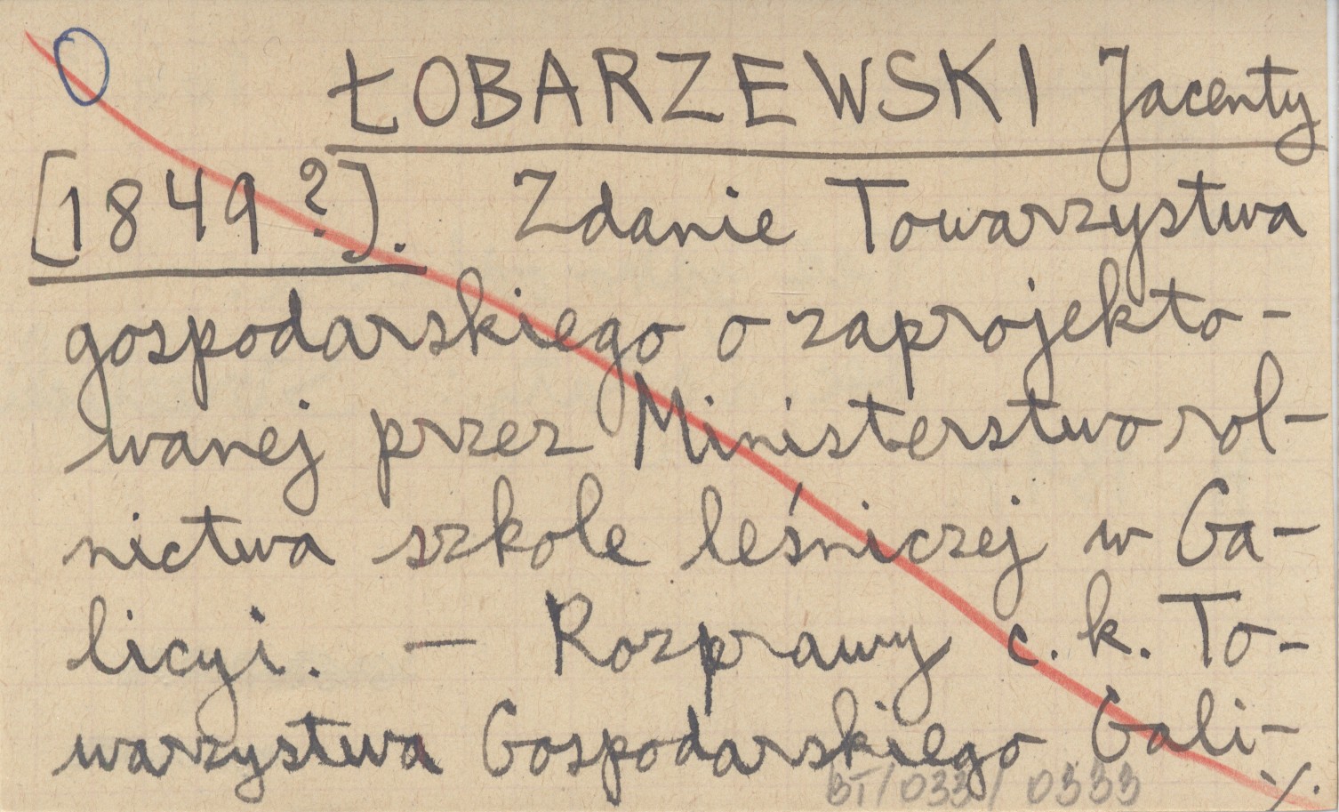 ŁOBARZEWSKI Jacenty [1849?] Zdanie Towarzystwa gospodarskiego o zaprojektowanej przez Ministerstwo rolnictwa szkole leśniczej w Galicyi.