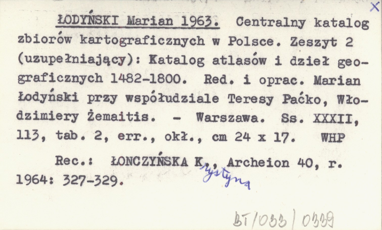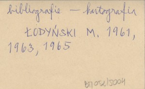 ŁODYŃSKI Marian 1963 Centralny katalog zbiorów kartograficznych w Polsce. Zeszyt 2 (uzupełniający): Katalog atlasów i dzieł geograficznych 1482-1800. Red. i oprac. Marian Łodyński przy współudziale Teresy Paćko, Włodzimiery Żemaitis.