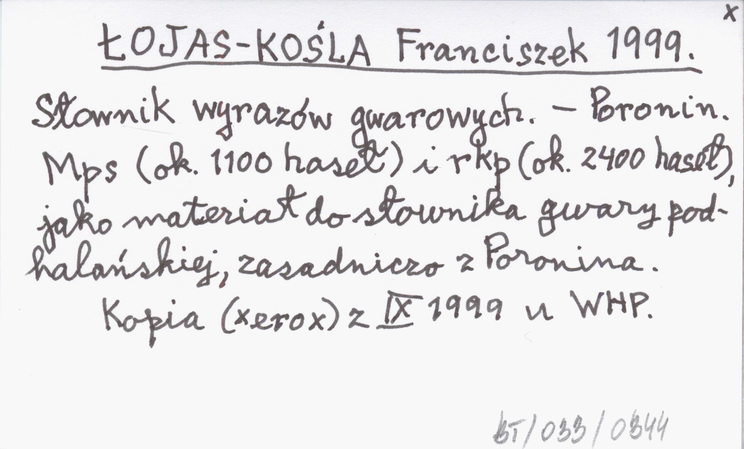 Poronin , Mps (ok. 1100 haseł) i rkp (ok. 2400 haseł), jako materiał do słownika gwary podhalańskiej, zasadniczo z Poronina. Kopia (xerox) z IX 1999