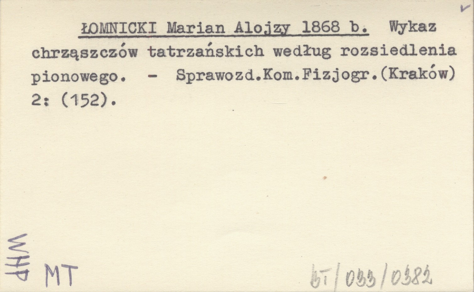 ŁOMNICKI Marian Alojzy 1868 b Wykaz chrząszczów tatrzańskich według rozsiedlenia pionowego.