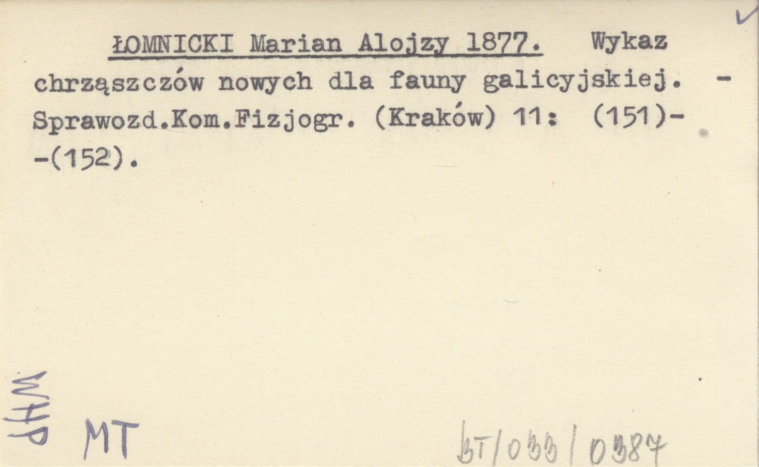 ŁOMNICKI Marian Alojzy 1877 Wykaz chrząszczów nowych dla fauny galicyjskiej.