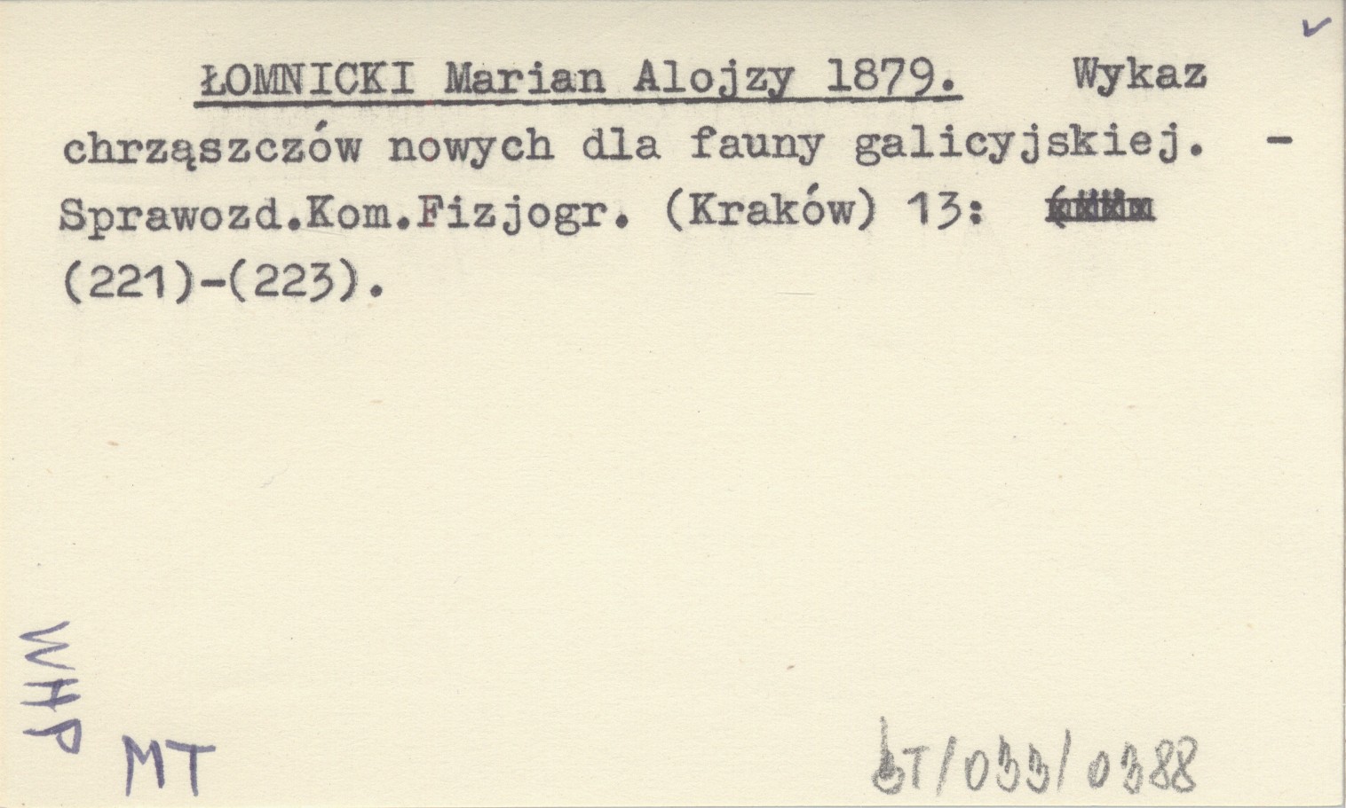 ŁOMNICKI Marian Alojzy 1879 Wykaz chrząszczów nowych dla fauny galicyjskiej.