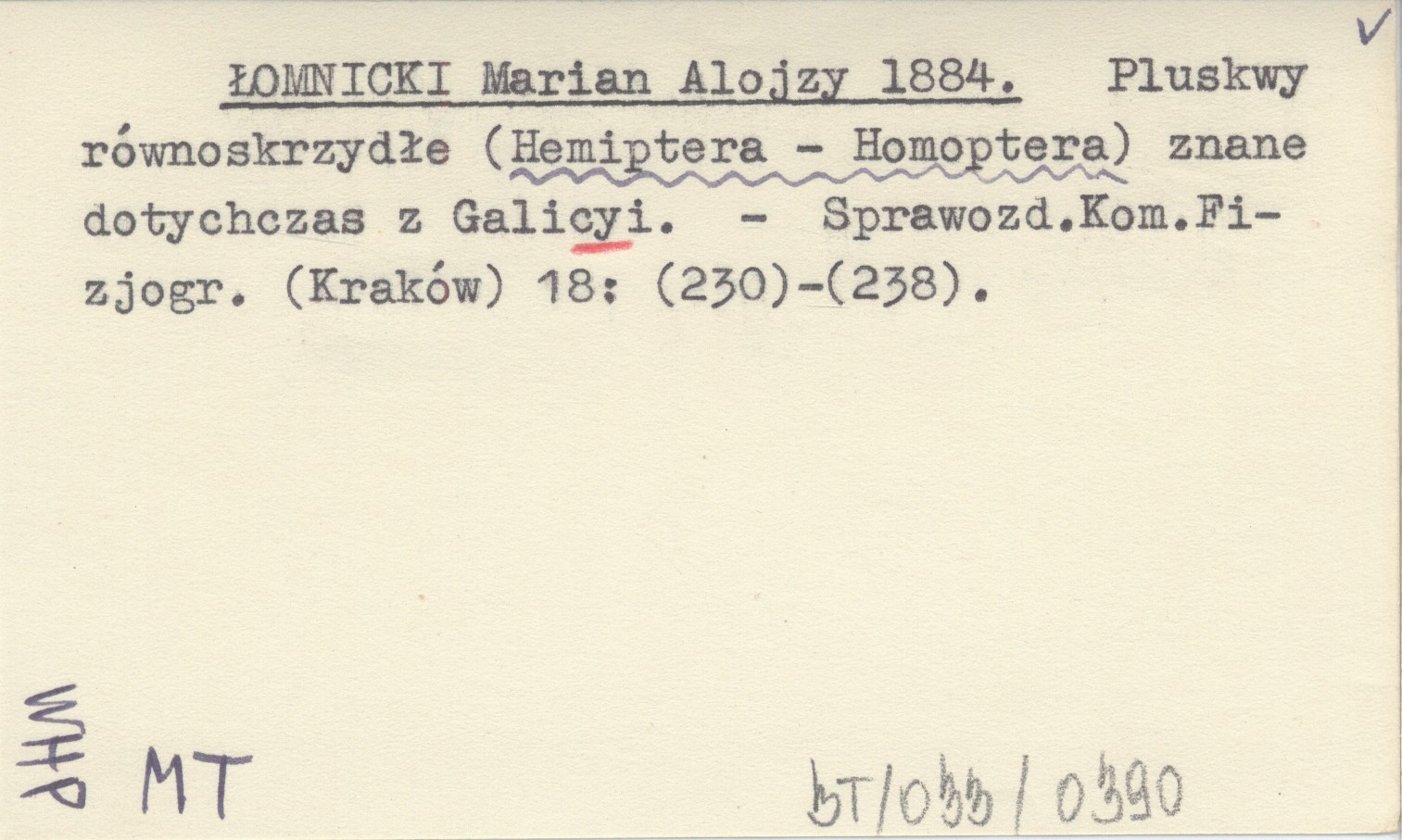 ŁOMNICKI Marian Alojzy 1884 Pluskwy równoskrzydłe (Hemiptera - Homoptera) znane dotychczas z Galicyi.