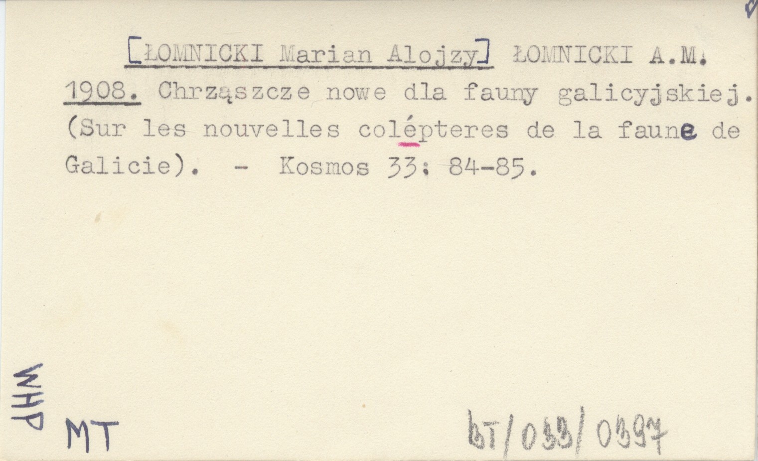 ŁOMNICKI A.M. [ŁOMNICKI Marian Alojzy] 1908 Chrząszcze nowe dla fauny galicyjskiej. (Sur les nouvelles colépteres de la faune de Galicie).