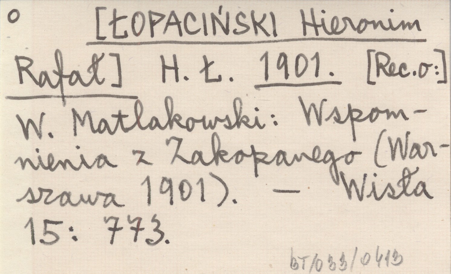 H. Ł. [ŁOPACIŃSKI Hieronim Rafał] 1901 W. Matlakowski: Wspomnienia z Zakopanego (Warszawa 1901).