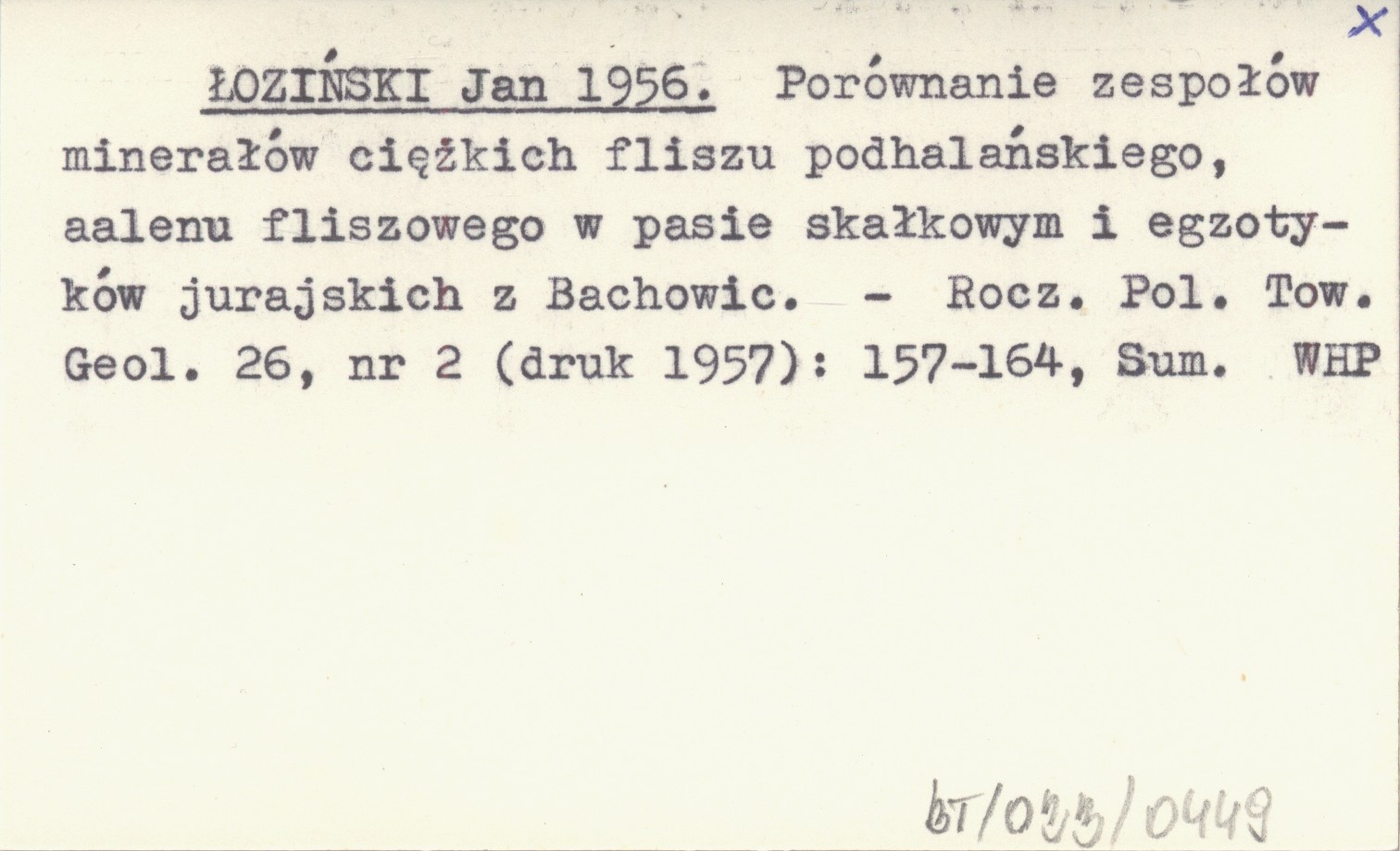 ŁOZIŃSKI Jan 1956 Porównanie zespołów minerałów ciężkich fliszu podhalańskiego, aalenu fliszowego w pasie skałkowym i egzotyków jurajskich z Bachowic.