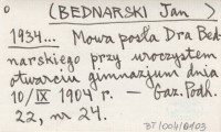 [BEDNARSKI Jan] 1934... Mowa posła Dra Bednarskiego przy uroczystem otwarciu gimnazjum dnia 10/IX 1904 r.