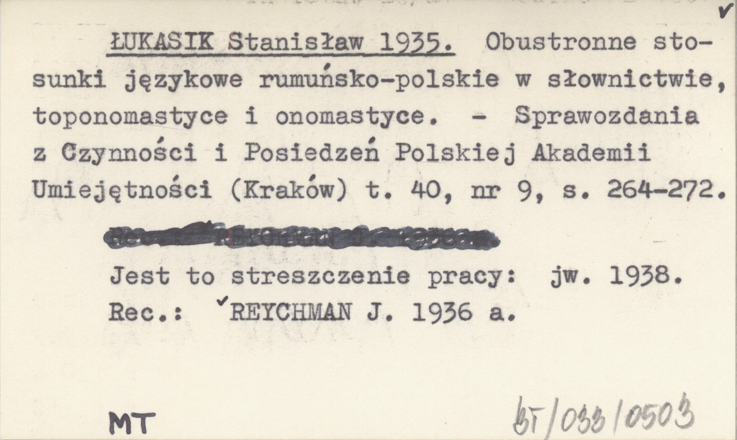 ŁUKASIK Stanisław 1935 Obustronne stosunki językowe rumuńsko-polskie w słownictwie, toponomastyce i onomastyce.