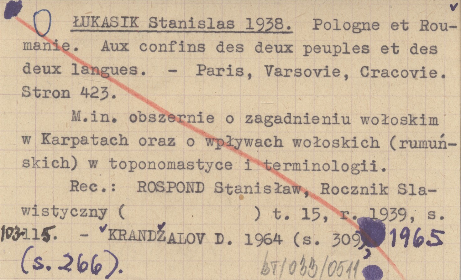 Paris ; Varsovie ; Cracovie ; , 423 s., okł., 24x17 cm. M.in. obszernie o zagadnieniu wołoskim w Karpatach oraz o wpływach wołoskich (rumuńskich) w toponomastyce i terminologii. REC: ROSPOND Stanisław, Rocznik Slawistyczny t. 15, r. 1939: 103-115 ; KRANDŽALOV D. 1964 (s. 309), 1965 (s. 266).