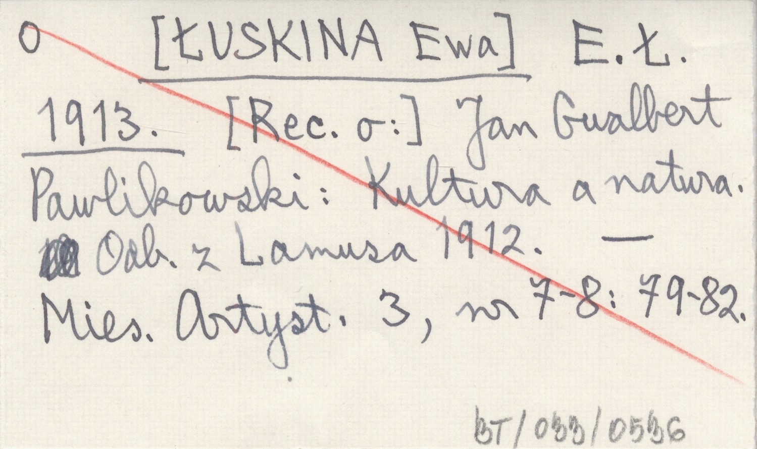 E. Ł. [ŁUSKINA Ewa] 1913 Jan Gwalbert Pawlikowski: Kultura a natura. Odb. z Lamusa 1912.