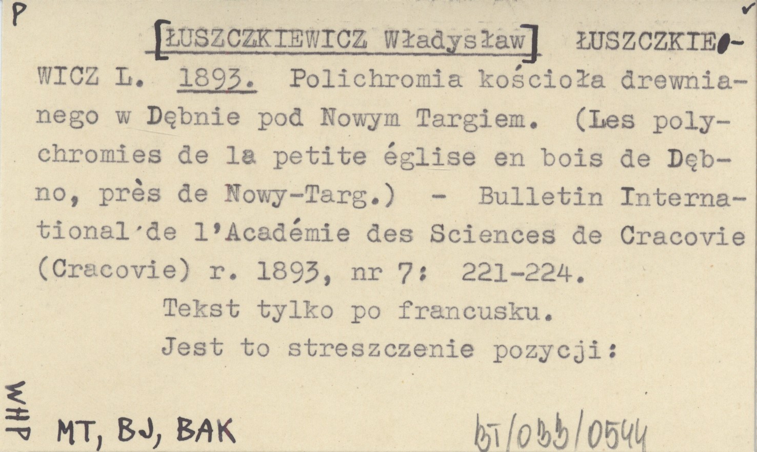 ŁUSZCZKIEWICZ L. [ŁUSZCZKIEWICZ Władysław] 1893 Polichromia kościoła drewnianego w Dębnie pod Nowym Targiem. (Les polychromies de la petite église en bois de Dębno, prés de Nowy-Targ).