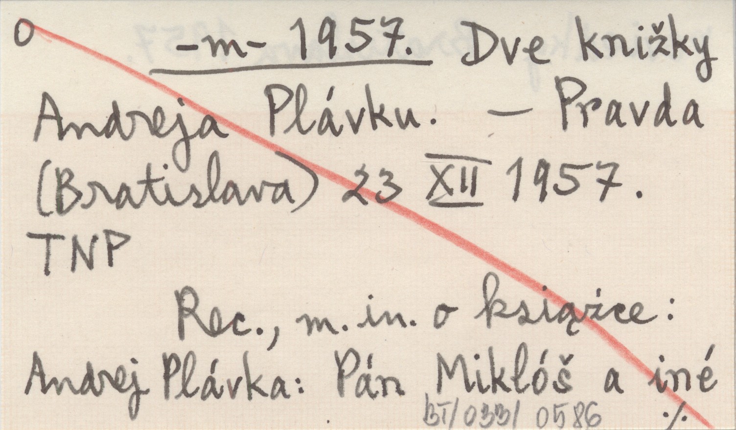 Pravda (Bratislava) , 23 XII 1957. Rec., m.in. o książce: Andrej Plávka: Pán Miklóš a iné poviedky. Bratislava 1957.