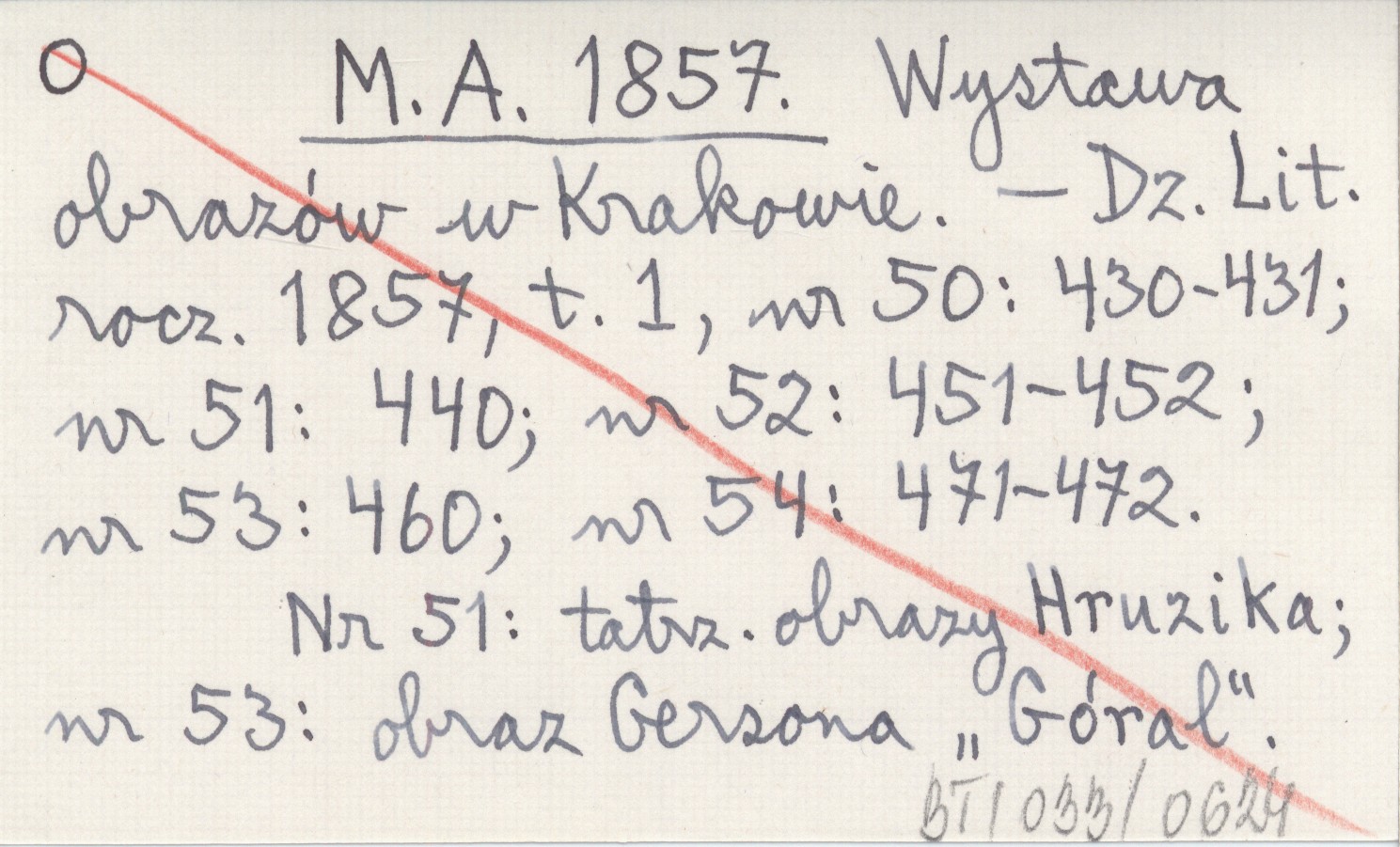 Dziennik Literacki, R. 1857, t. 1, nr 50: 430-431 ; nr 51: 440 ; nr 52: 451-452 ; nr 53: 460 ; nr 54: 471-472. Nr 51: tatrz. obrazy Hruzika; nr 53: obraz Gersona "Góral".