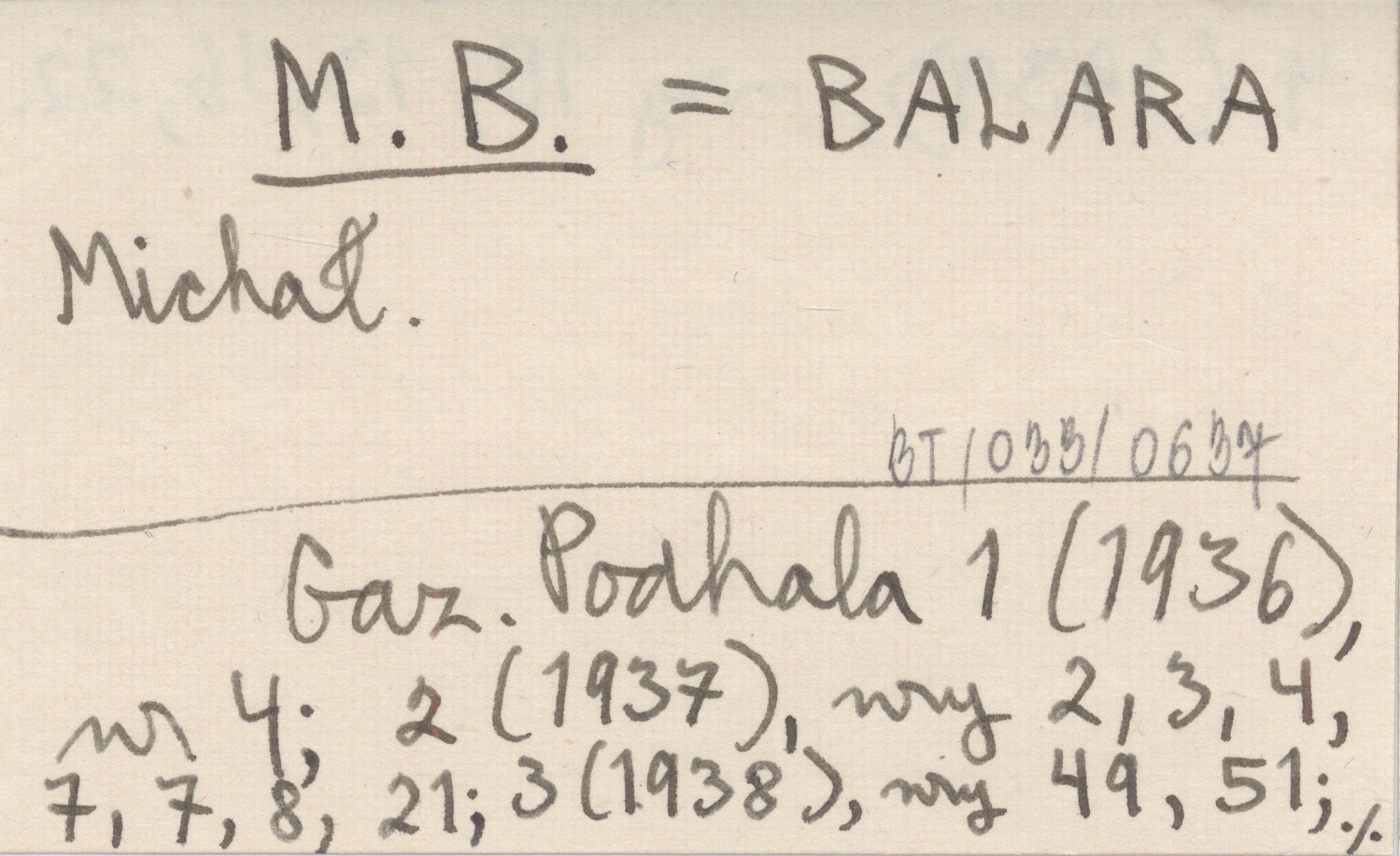 M. B. BALARA Michał Gazeta Podhala 1 (1936), nr 4 ; 2 (1937), nr 2-4, 7-8, 21 ; 3 (1938), nr 49, 51 ; 4 (1939), nr 10, 13, 16, 22.