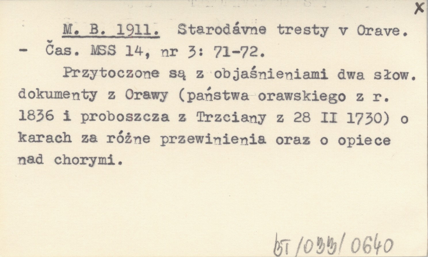 Čas. MSS, 14, nr 3: 71-72. Przytoczone są z objaśnieniami dwa słow. dokumenty z Orawy (państwa orawskiego z r. 1836 i proboszcza z Trzciany z 28 II 1730) o karach za różne przewinienia oraz o opiece nad chorymi.