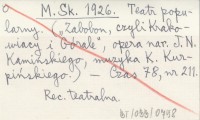 M. Sk. 1926 Teatr popularny. ("Zabobon, czyli Krakowiacy i Górale", opera nar. J. N. Kamińskiego, muzyka K. Kurpińskiego.).