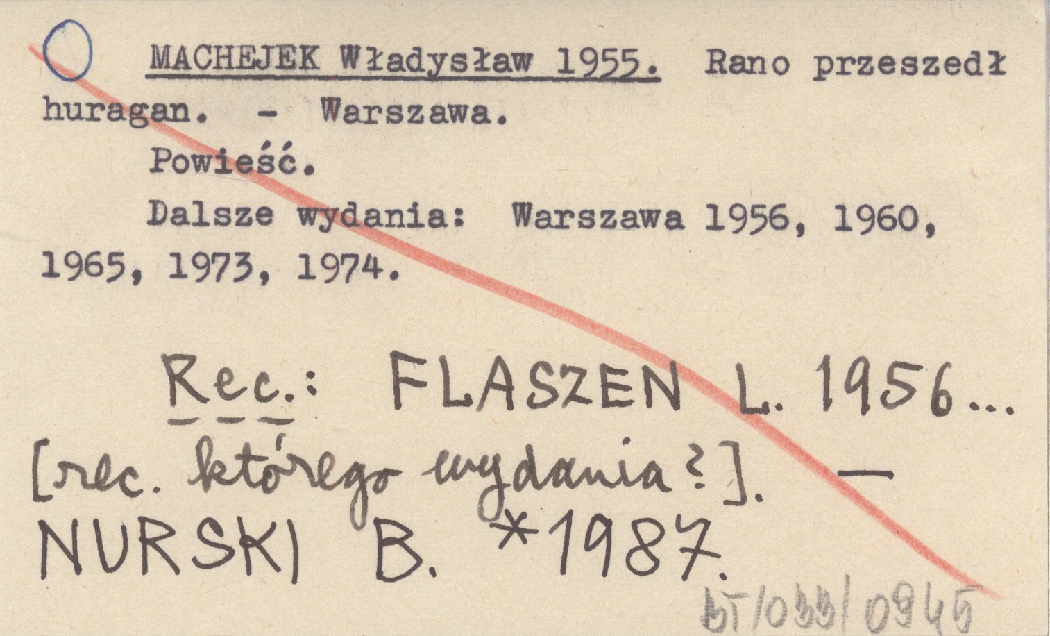 Warszawa , Powieść. Dalsze wydania: Warszawa 1956, 1960, 1965, 1973, 1974. REC: FLASZEN L. 1956... [rec. którego wydania?] ; NURSKI B. 1987 ;