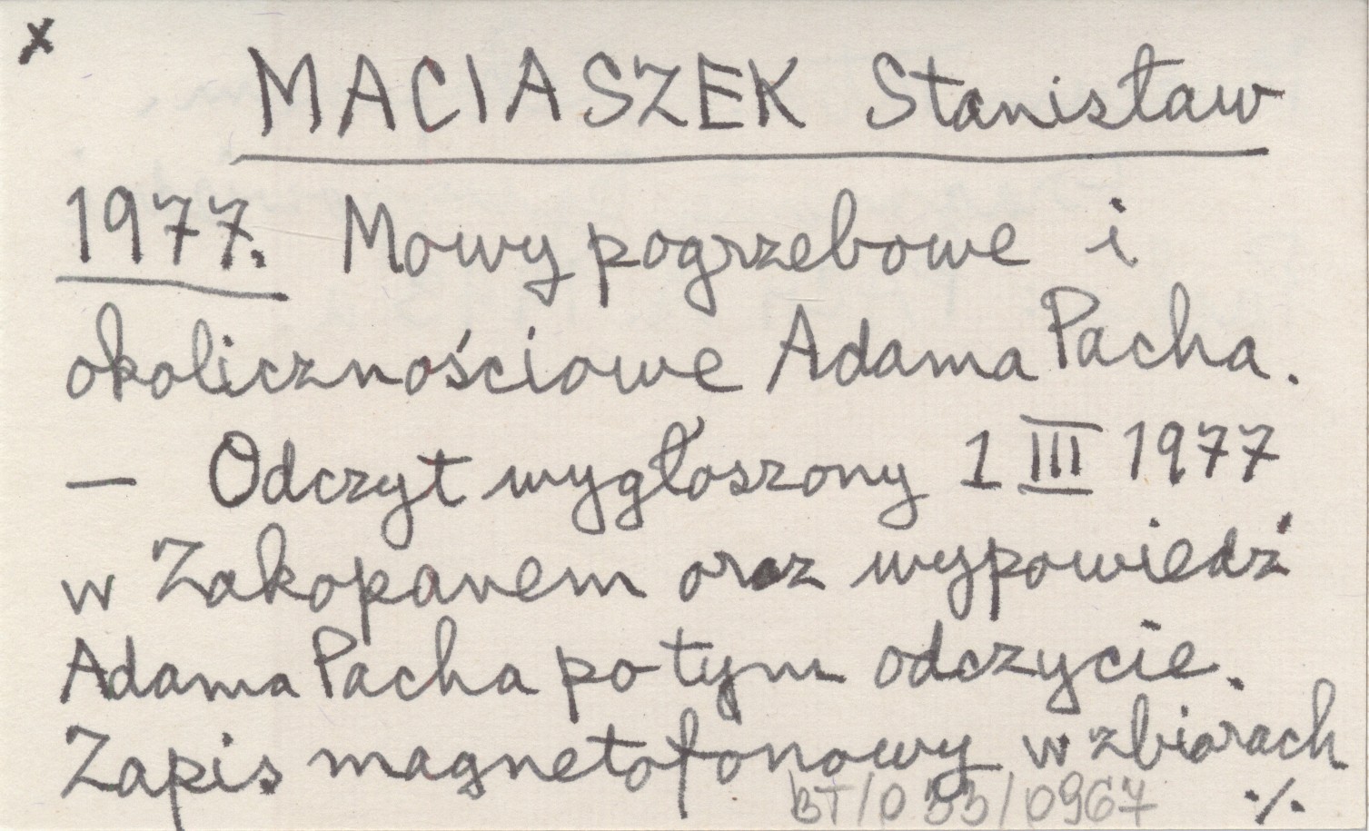 , Odczyt wygłoszony 1 III 1977 w Zakopanem oraz wypowiedź Adama Pacha po tym odczycie. Zapis magnetofonowy w zbiorach Muzeum Tatrz. w Zakopanem. Fragmenty tej wypowiedzi Pacha: PACH A. 1993 a