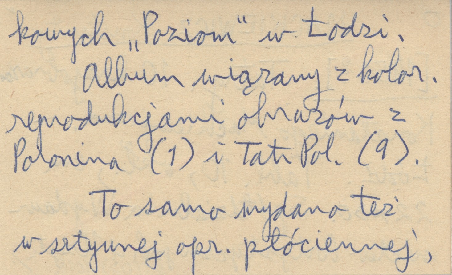 Spółdzielnia Wydawnictw Artystycznych i Użytkowych "Poziom" w Łodzi, Łódź , 10 k. tabl., okł., 22x30 cm. Album wiązany z kolor. reprodukcjami obrazów z Poronina (1) i Tatr Pol. (9). To samo wydano też w sztywnej opr. płóciennej.