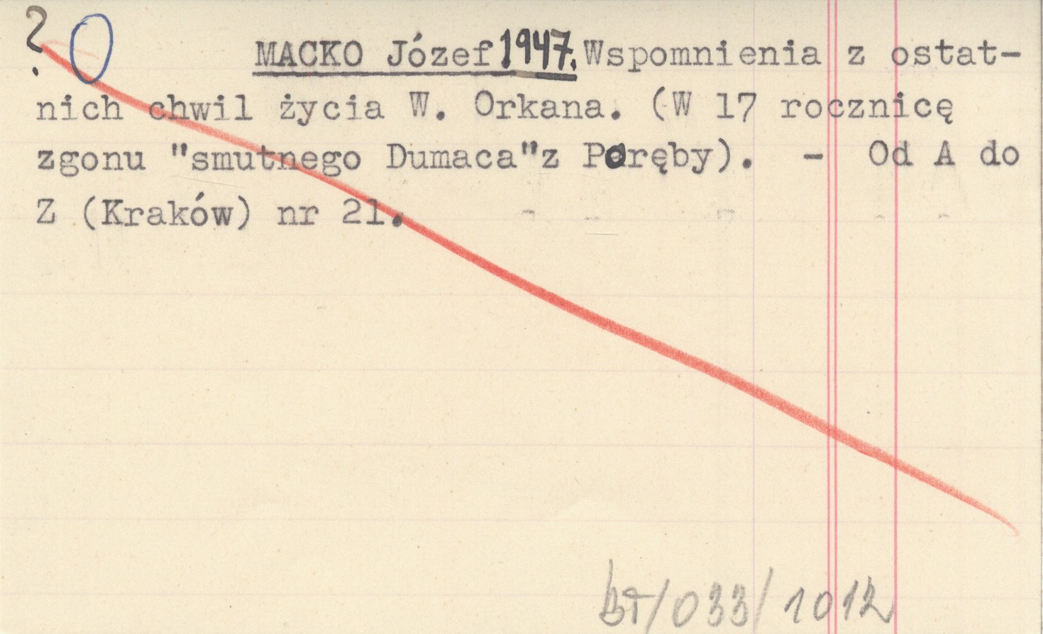 MACKO Józef 1947 Wspomnienia z ostatnich chwil życia W. Orkana. (W 17 rocznicę zgonu "smutnego Dumaca"z Poręby).