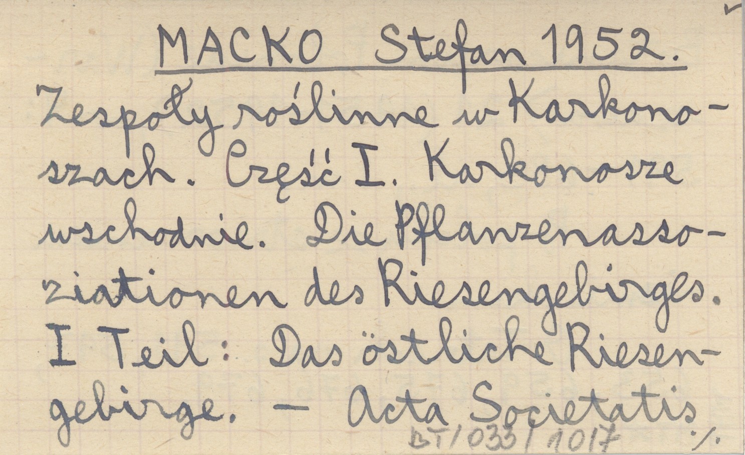 MACKO Stefan 1952 Zespoły roślinne w Karkonoszach. Część I. Karkonosze wschodnie. Die Pflanzenassoziationen des Riesengebirges. I Teil: Das östliche Riesengebirge.