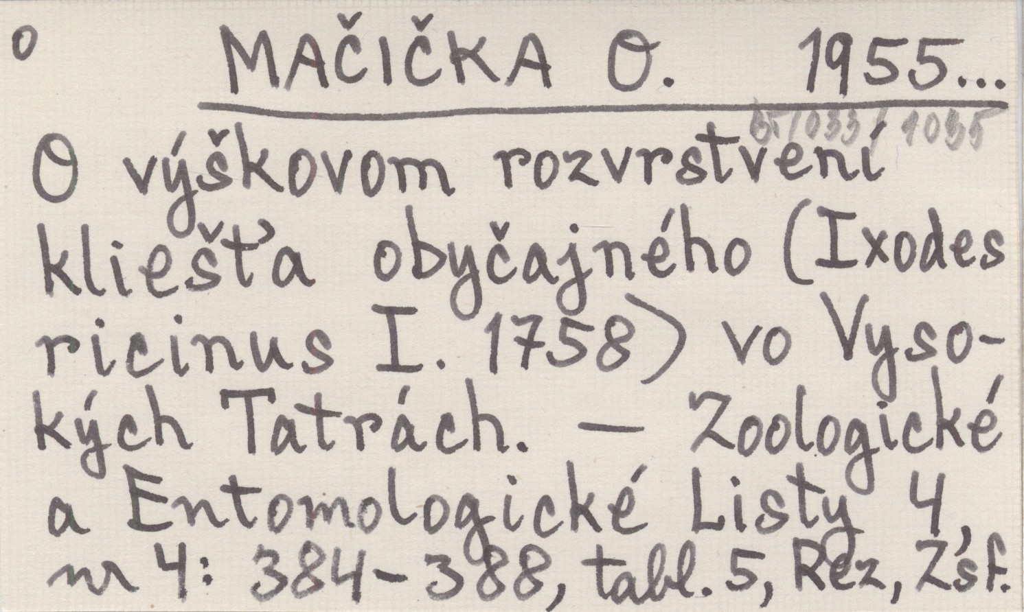 MAČIČKA O. 1955... O výąkovom rozvrstvení klieą»a obyčajného (Ixodes ricinus I. 1758) vo Vysokých Tatrách.