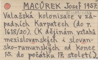 MACŮREK Josef 1957 Valašská kolonisace v západních Karpatech (do r. 1618/20). (K dějinám vztahů mezislovanských i slovansko-rumunských od konce 15. do počátku 17. století).