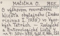 MAČIČKA O. 1955... O výškovom rozvrstvení kliešťa obyčajného (Ixodes ricinus I. 1758) vo Vysokých Tatrách.
