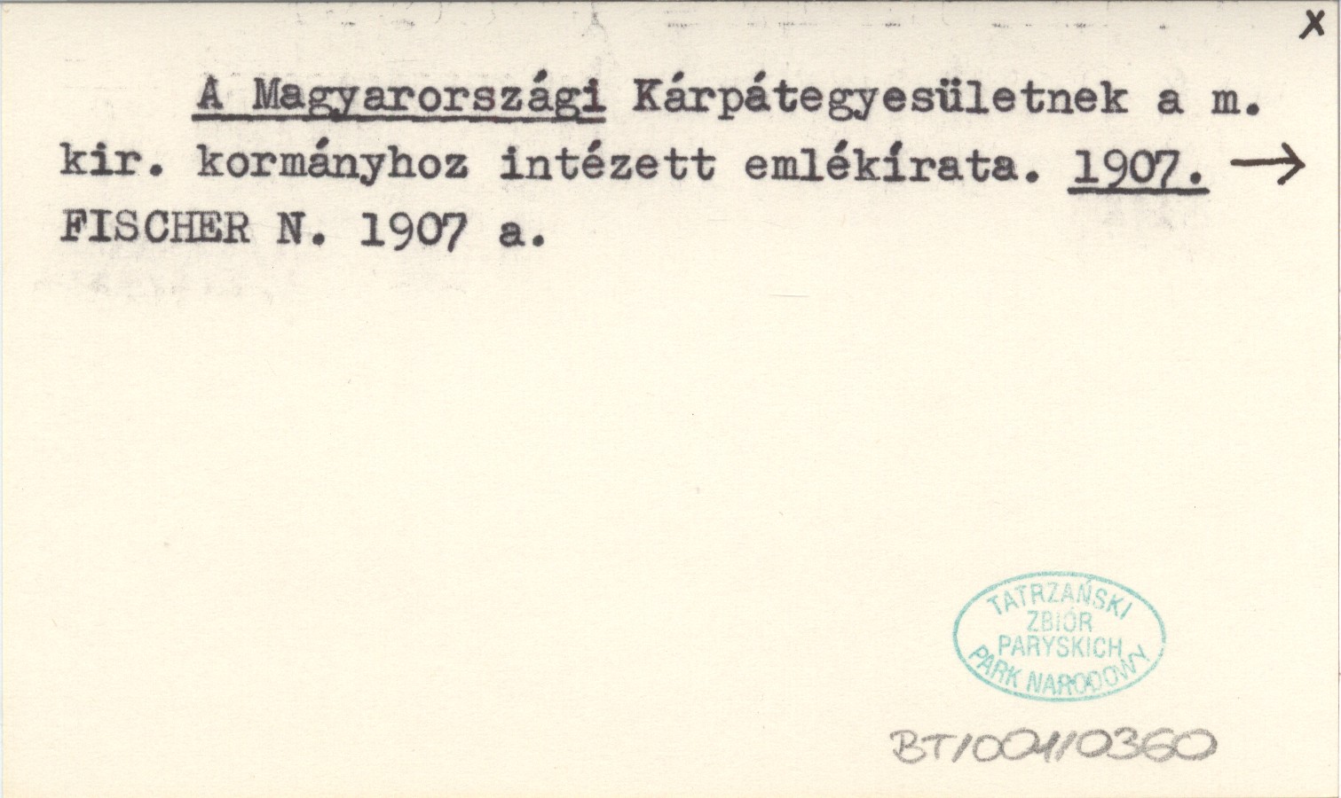 A Magyarországi Kárpátegyesületnek a m. kir. kormányhoz intézett emlézett emlékírata. 1907