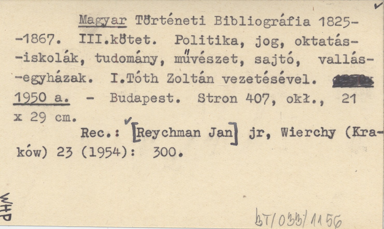 Magyar Történeti Bibliográfia 1825-1867. III.kötet. Politika, jog, oktatás-iskolák, tudomány, művészet, sajtó, vallás-egyházak. I.Tóth Zoltán vezetésével. 1950 a