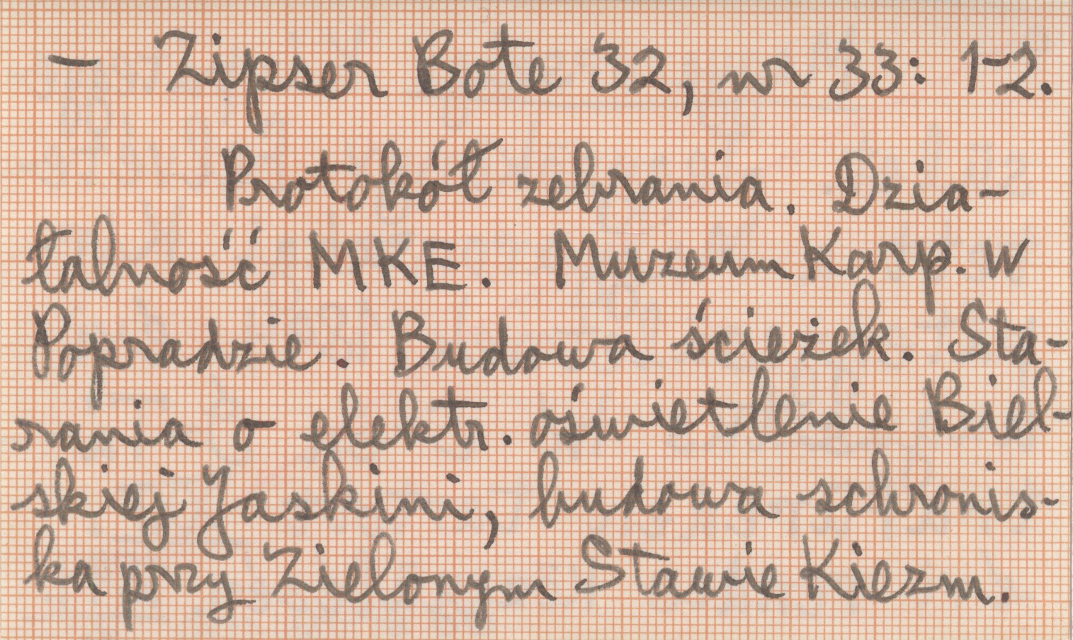 Zipser Bote, 32, nr 33: 1-2. Protokół zebrania. Działalno¶ć MKE. Muzeum Karp. w Popradzie. Budowa ¶cieżek. Starania o elektr. o¶wietlenie Bielskiej Jaskini, budowa schroniska przy Zielonym Stawie Kiezm.