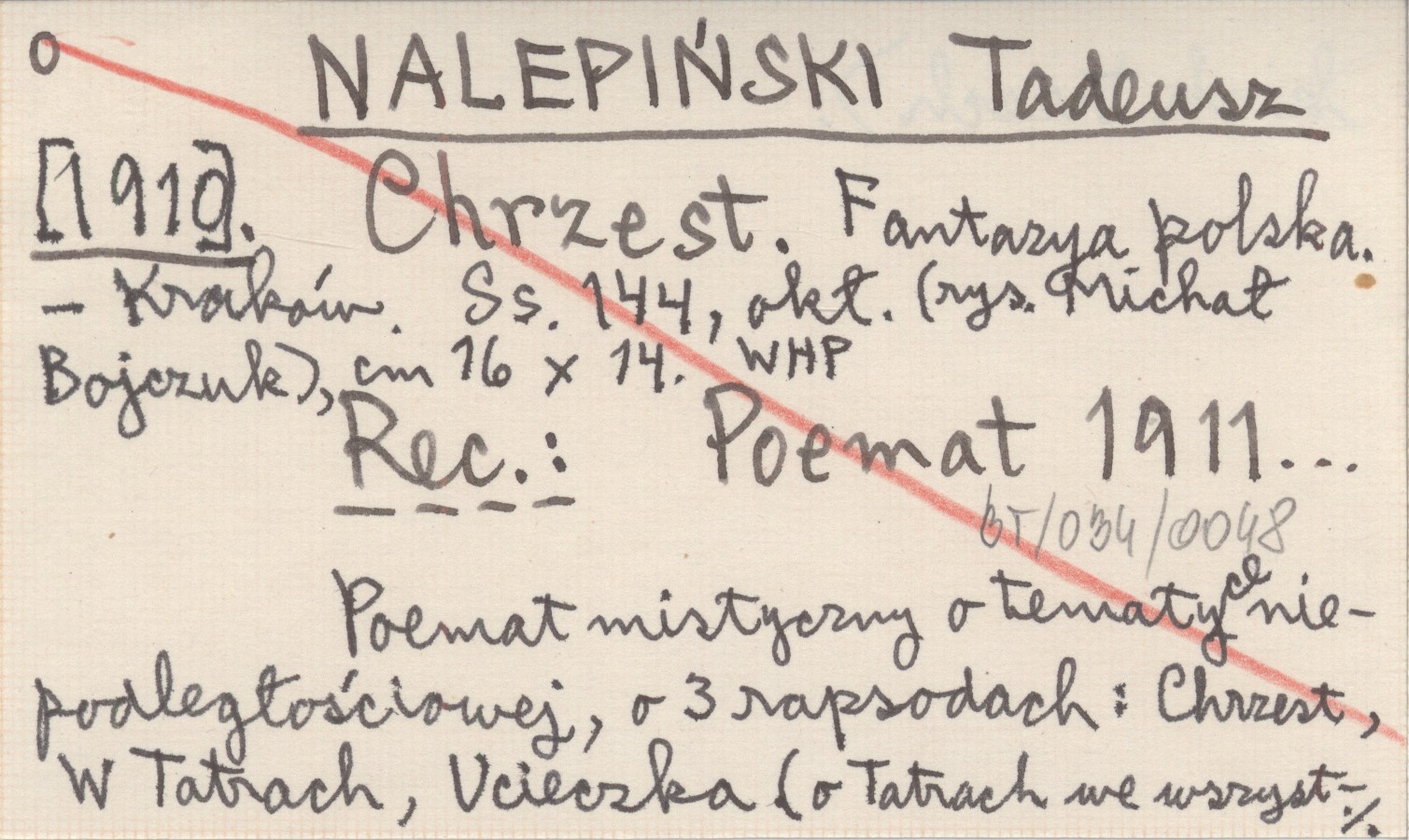 Kraków , 144 s., okł. (rys. Michał Bojczuk), 16x14 cm. Poemat mistyczny o tematyce niepodległościowej, o 3 rapsodach: Chrzest, W Tatrach, Ucieczka (o Tatrach we wszystkich trzech). REC: Poemat 1911...