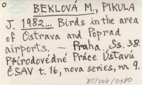 BEKLOVÁ M. PIKULA, J. ; 1982... Birds in the area of Ostrava and Poprad airports.