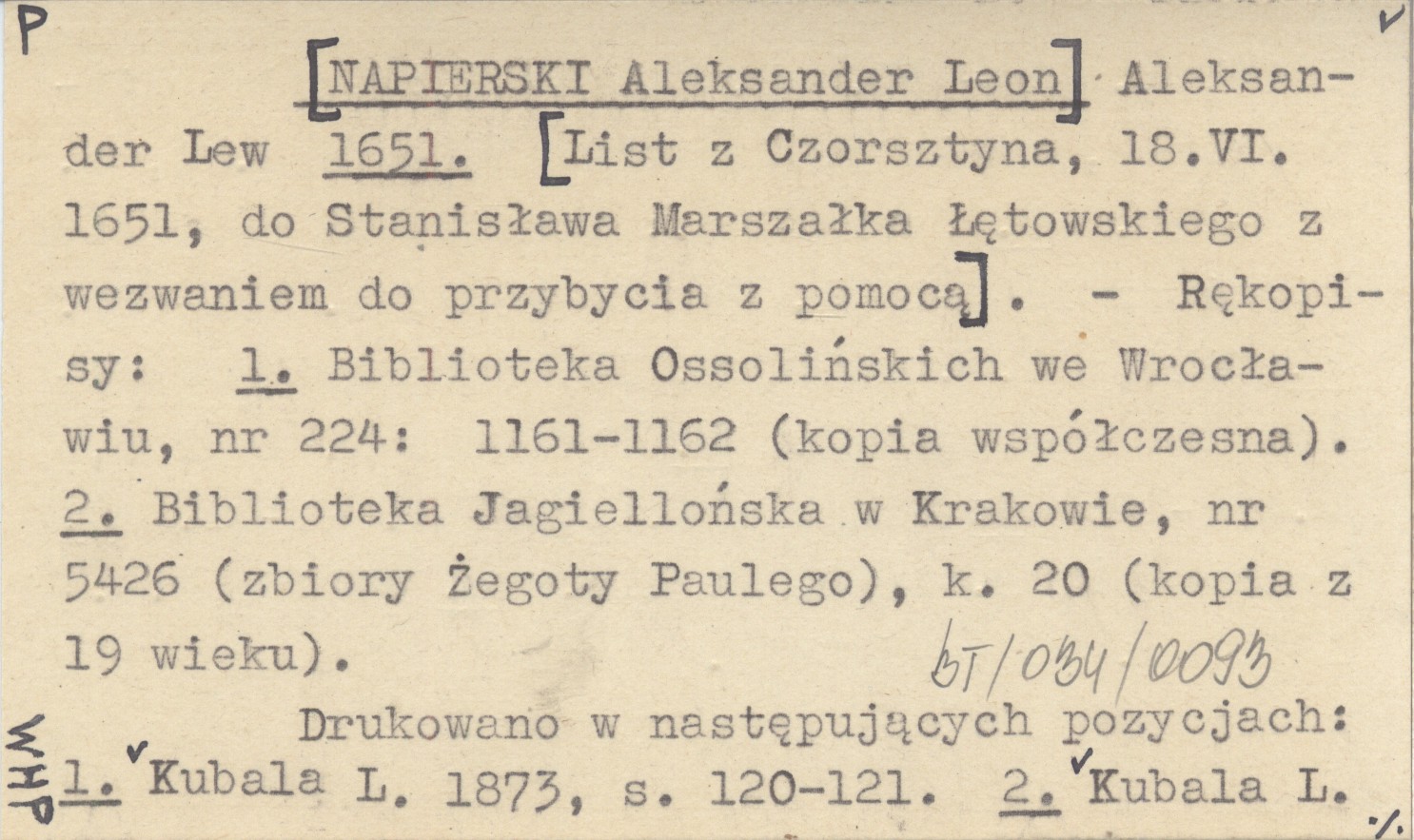 Aleksander Lew [NAPIERSKI Aleksander Leon] 1651 [List z Czorsztyna, 18.VI.1651, do Stanisława Marszałka Łętowskiego z wezwaniem do przybycia z pomocą].