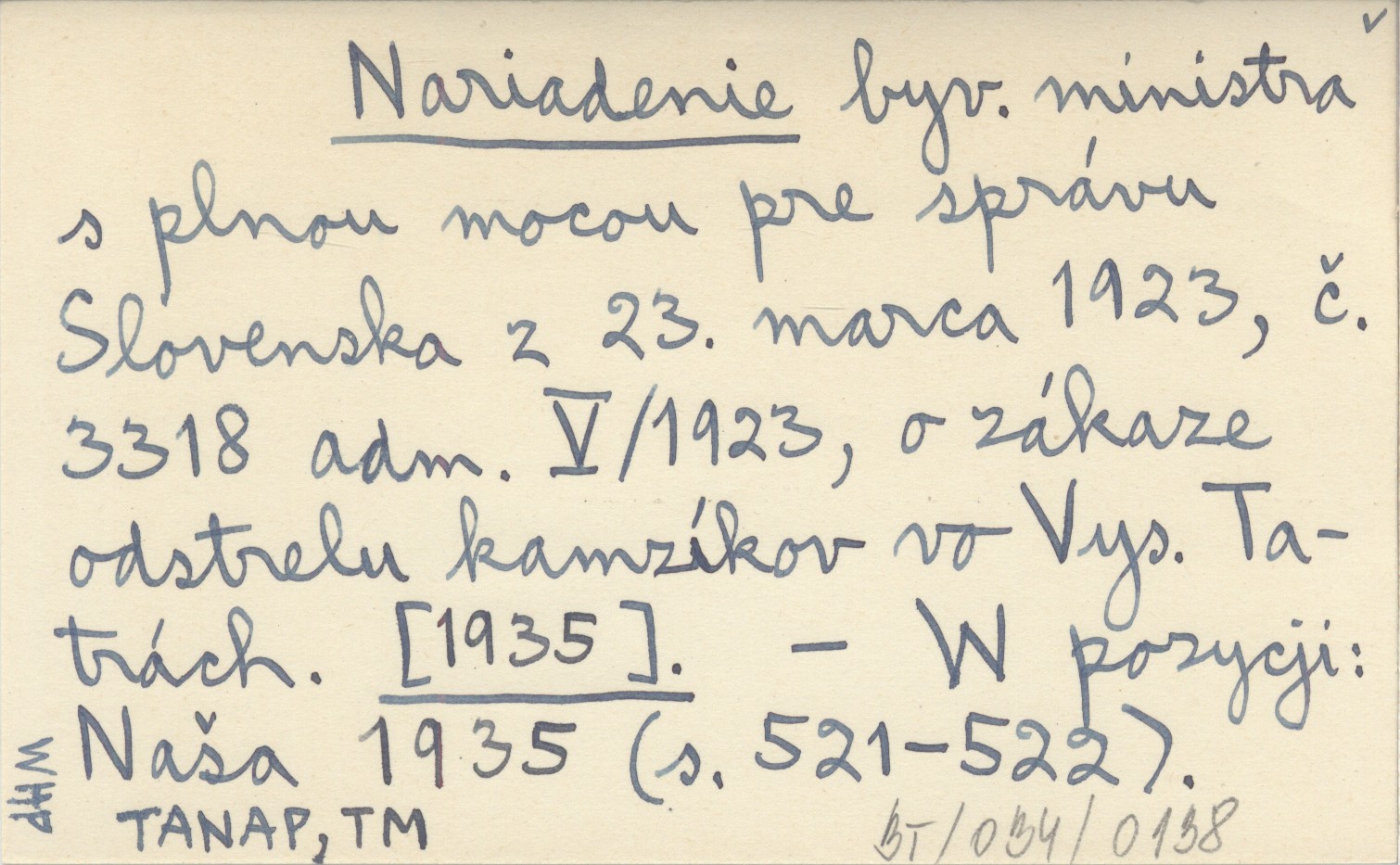 Nariadenie byv. ministra s plnou mocou pre správu Slovenska z 23. marca 1923, č. 3318 adm. V/1923, o zákaze odstrelu kamzíkov vo Vys. Tatrách. [1935]
