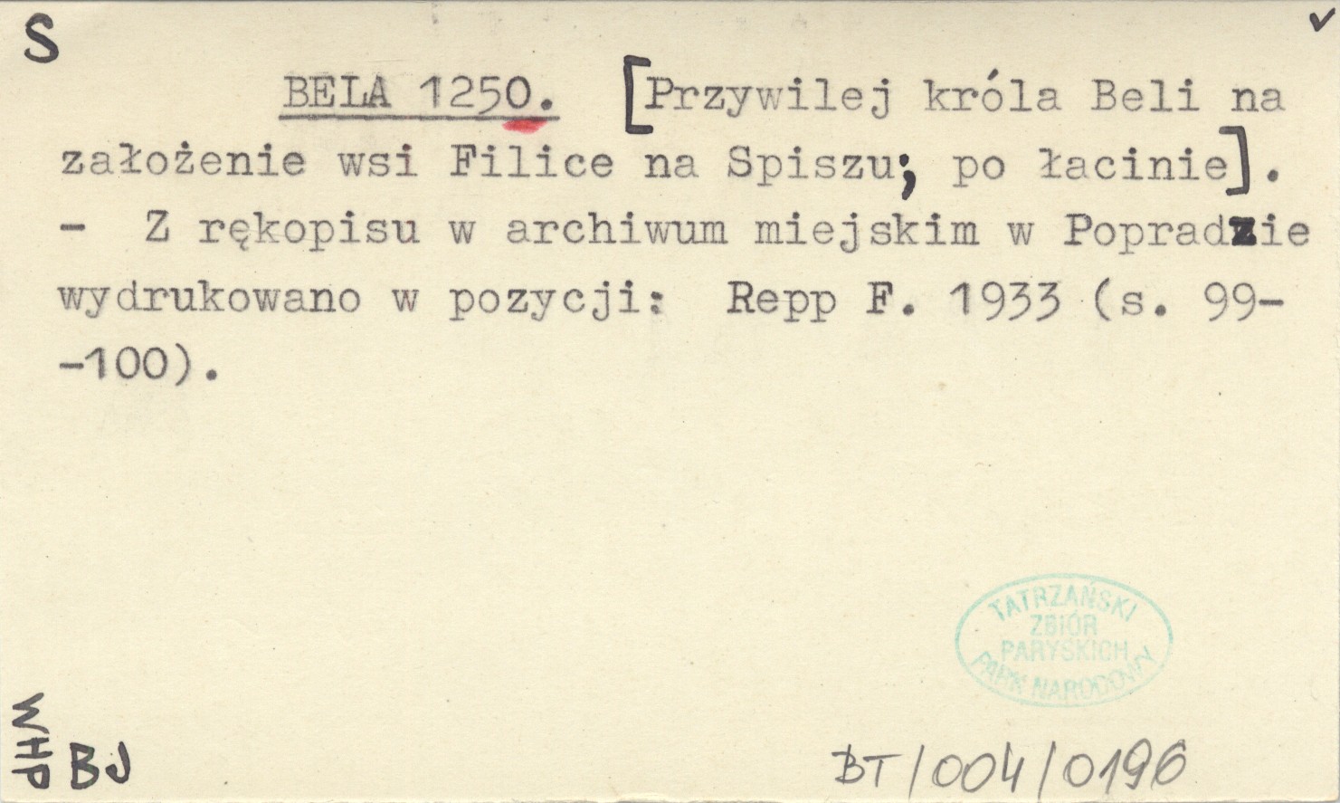 BELA 1250 [Przywilej króla Beli na założenie wsi Filice na Spiszu.]