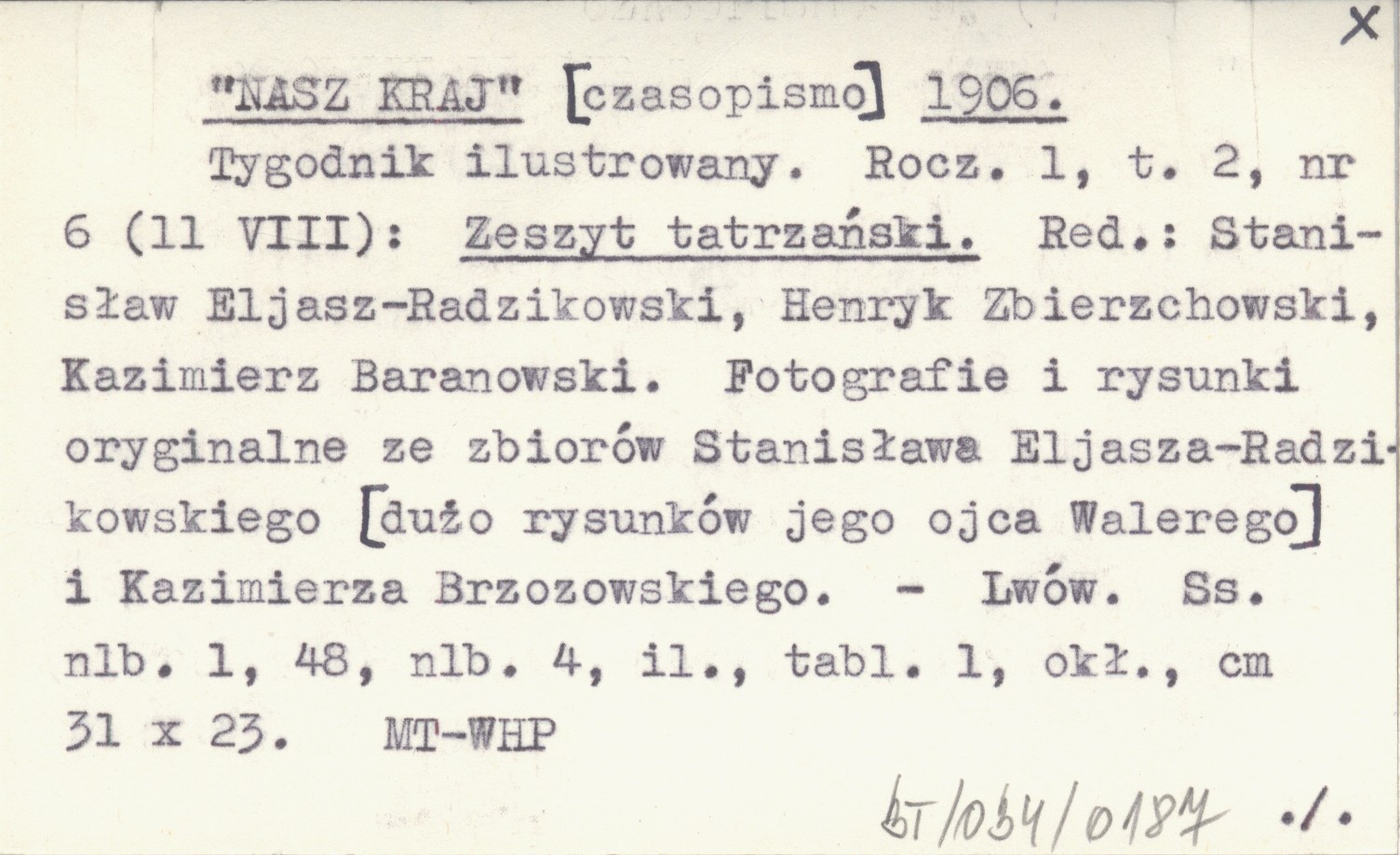 NASZ KRAJ (Lwów) , R. 1, t. 2, nr 6 (11 VIII), [1], 48, [4] s. il., 1 k., okł., 31x23 cm. Tygodnik ilustrowany. Zeszyt tatrzański. Fotografie i rysunki oryginalne ze zbiorów Stanisława Eljasza-Radzikowskiego [dużo rysunków jego ojca Walerego] i Kazimierza Brzozowskiego. Zawiera pozycje: BARANOWSKI K. 1906, 1906 a-c, BRZEGA W. 1906, BRZOZOWSKI K. 1906, BULAS J. 1906, 1906 a, ELJASZ-RADZIKOWSKI W. 1906, 1906 a-j, GWIŻDŻ F. 1906, JEDLICZ J. 1906, KASPROWICZ J. 1906, LUBERTOWICZ Z. 1906, Łyżnik 1906, MAKUSZYŃSKI K. 1906, Ogłoszenia 1906, ORKAN W. 1906, PANEK-JANKOWSKA W. 1906, RADZIKOWSKI S.E. 1906 d-j, SCHRÖDER A. 1906, Spinka 1906, TETMAJER K.P. 1906 b, WOLSKI W. 1906, WYCZÓŁKOWSKI L. 1906, WYSPIAŃSKI S. 1906, ZAGÓRSKI A. 1906, ZBIERZCHOWSKI H. 1906, 1906 a, b.