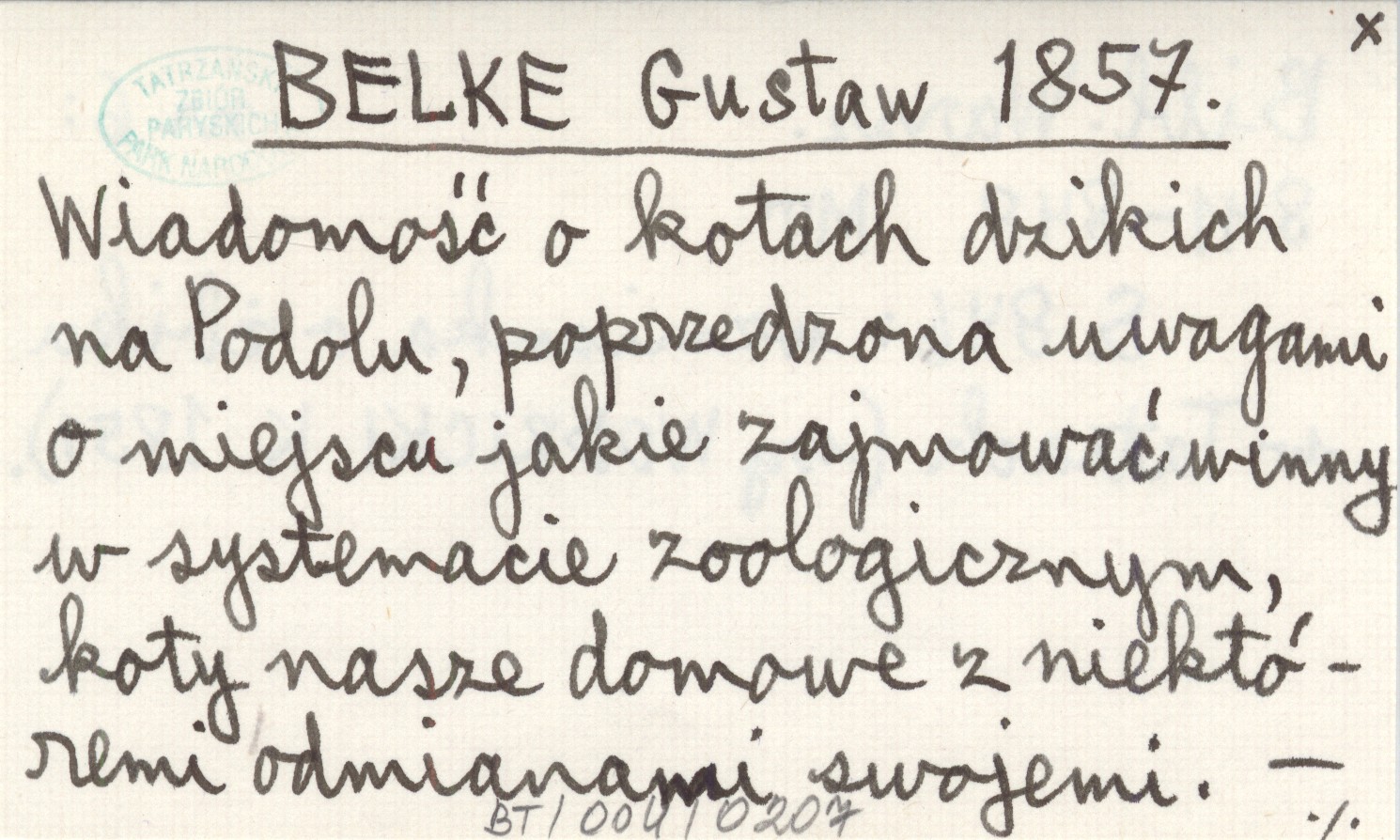 BELKE Gustaw 1857 Wiadomość o kotach dzikich na Podolu, poprzedzona uwagami o miejscu jakie zajmować winny w systemacie zoologicznym, koty nasze domowe z niektóremi odmianami swojemi.