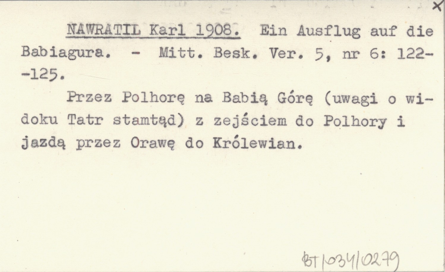 Mitt. Besk. Ver., 5, nr 6: 122-125. Przez Polhorę na Babią Górę (uwagi o widoku Tatr stamtąd) z zejściem do Polhory i jazdą przez Orawę do Królewian.