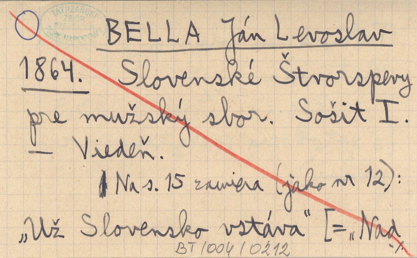 BELLA Ján Levoslav 1864 Slovenské Štvorspevy pre mužský sbor.