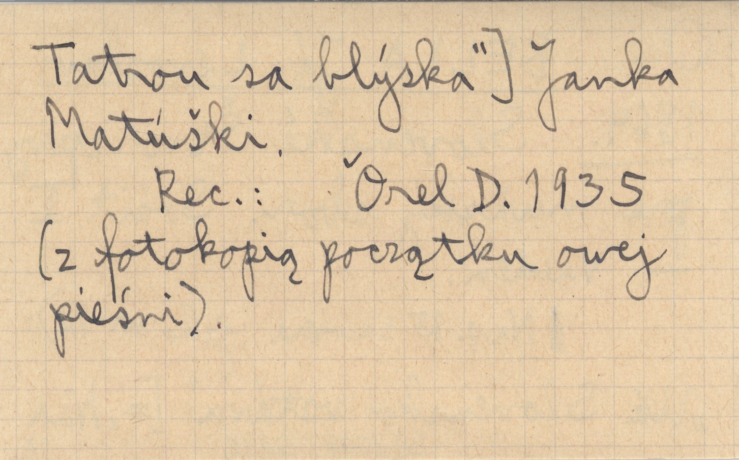 Viedeň , Z. 1. Na 15 s. zawiera (jako nr 12): "Už Slovensko vstáva" [="Nad Tatrou sa blýska"] Janka Matúški. REC: OREL D. 1935 (z fotokopią początku owej pieśni).