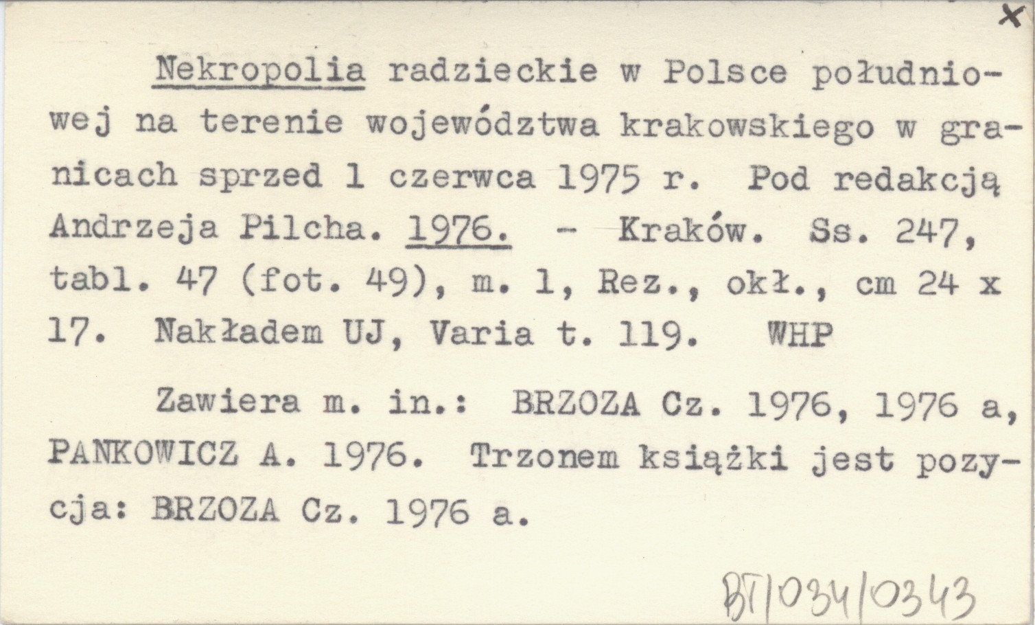 Kraków , 247 s., 47 k. tabl. (49 fot.), 1 m., Rez., okł., 24x17 cm. Nakładem UJ, Varia t. 119. Zawiera m.in.: BRZOZA Cz. 1976, 1976 a, PANKOWICZ A. 1976. Trzonem książki jest pozycja: BRZOZA Cz. 1976 a.