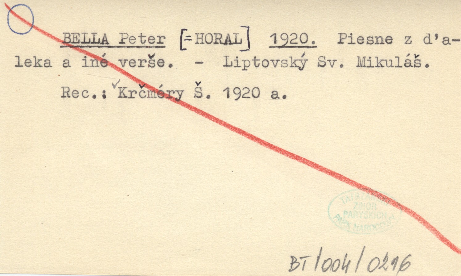 =HORAL BELLA Peter 1920 Piesne z ďaleka a iné verše.