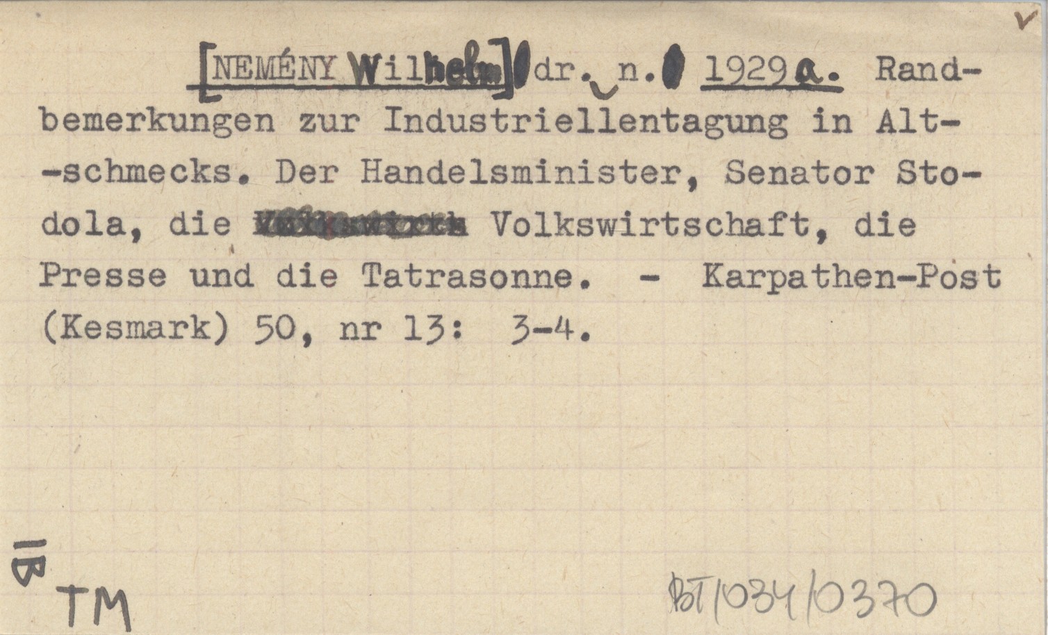 dr.n. [NEMÉNY Wilhelm] 1929 a Randbemerkungen zur Industriellentagung in Alt-schmecks. Der Handelsminister, Senator Stodola, die Volkswirtschaft, die Presse und die Tatrasonne.
