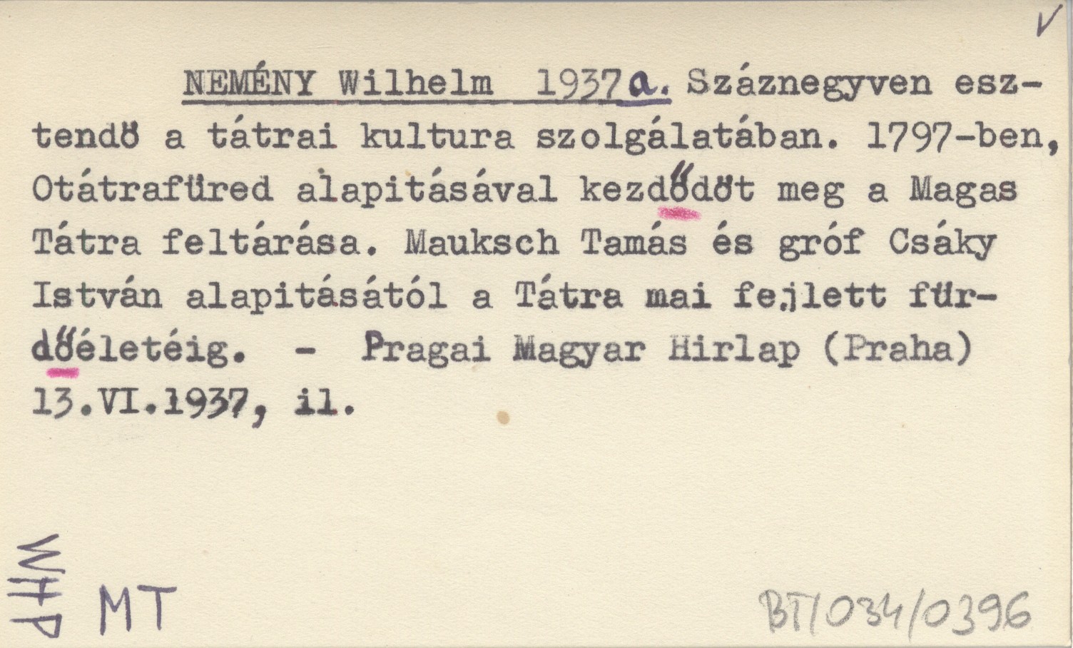 NEMÉNY Wilhelm 1937 a Száznegyven esztendö a tátrai kultura szolgálatában. 1797-ben, Otátrafüred alapitásával kezdődöt meg a Magas Tátra feltárása. Mauksch Tamás és gróf Csáky István alapitásától a Tátra mai fejlett fürdőeletéig.