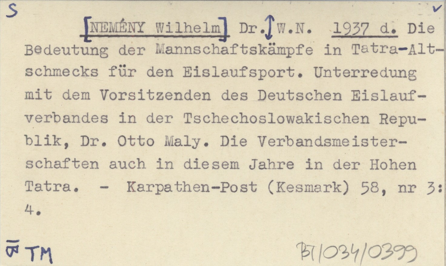 Dr. W.N. [NEMÉNY Wilhelm] 1937 d Die Bedeutung der Mannschaftkämpfe in Tatra-Altschmecks für den Eislaufsport. Unterredung mit dem Vorsitznden des Deutschen Eislaufverbandes in der Tschechoslowakischen Republik, Dr. Otto Maly. Die Verbandsmeisterschaften auch in diesem Jahre in der Hohen Tatra.