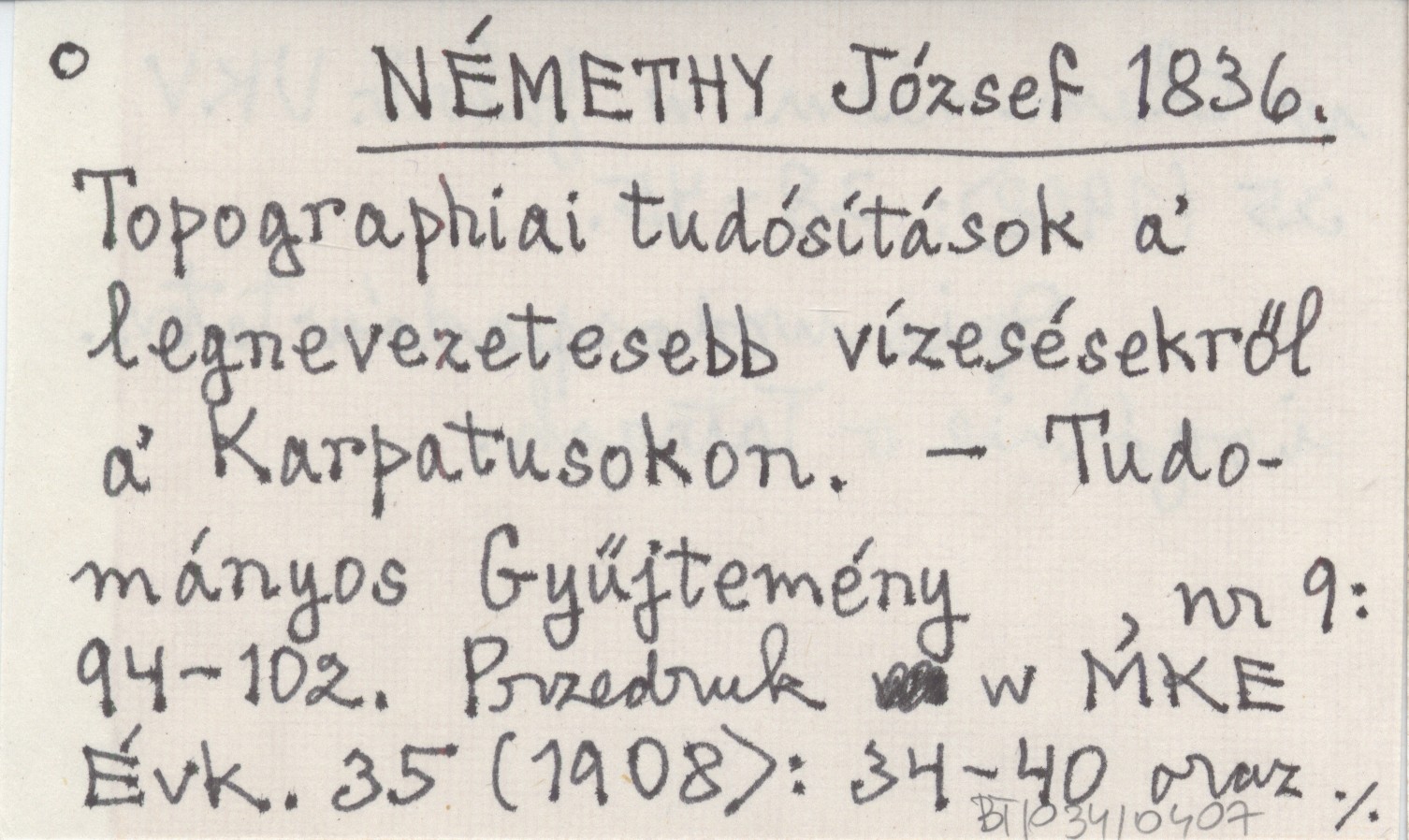 Tudományos Gyűjtemény, Nr 9: 94-102. Opis wodospadów tatrz. i ogólnie o Tatrach. Przedruk w MKE Évk. 35 (1908): 34-40 oraz w tłum. niem. w Jahrb. UKV 35 (1908): 38-45.